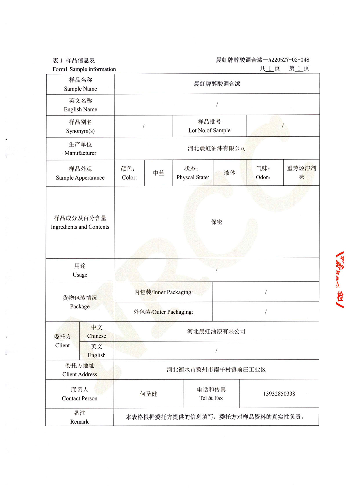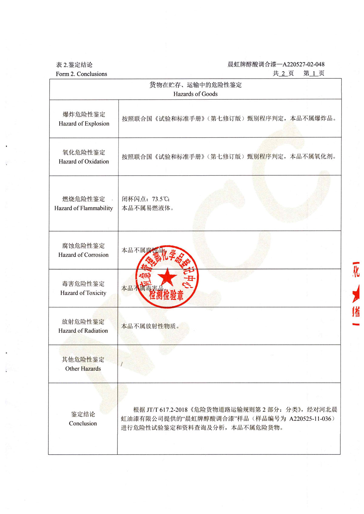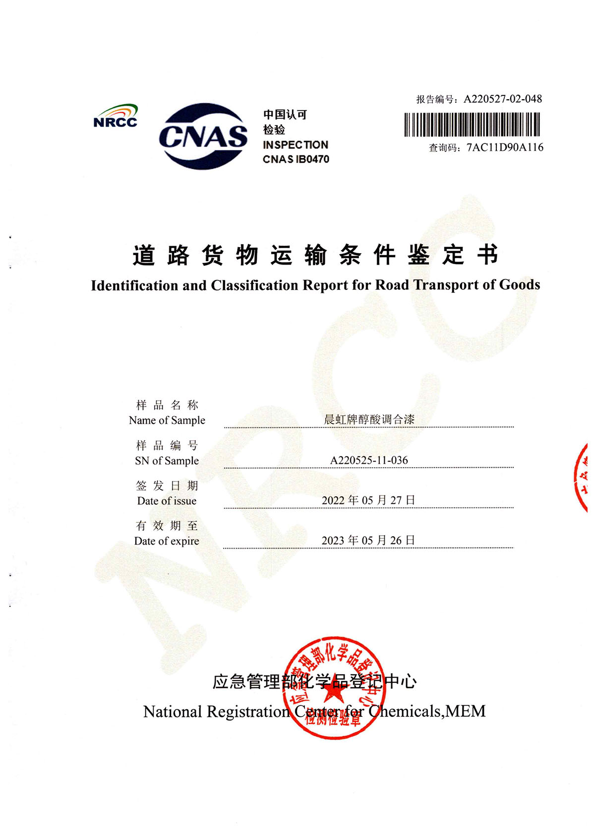 晨虹醇酸調(diào)合漆道路貨物運(yùn)輸鑒定書
